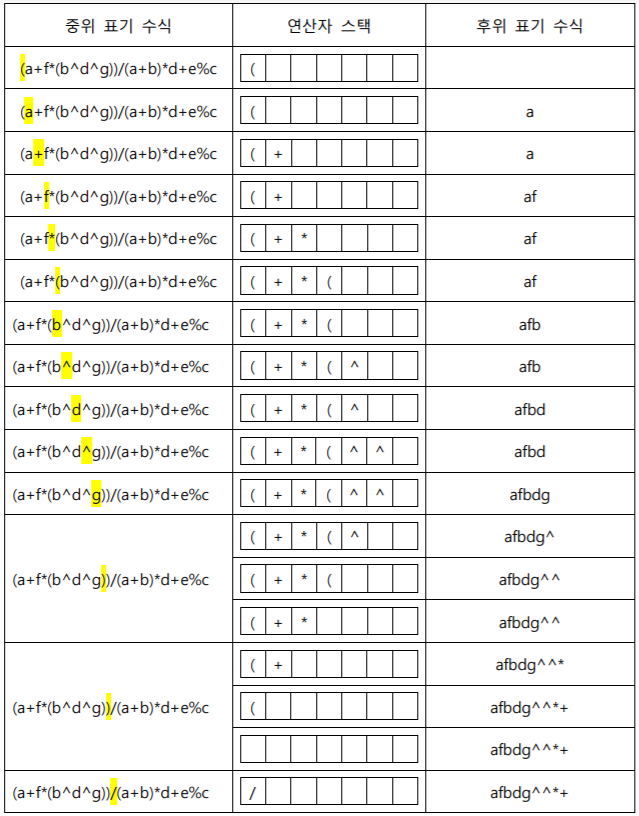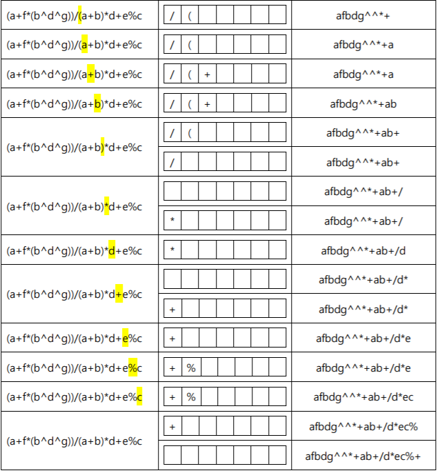 예시) (a+f(b^d^g))/(a+b)d+e%c 을 후위 표기식으로 변환하는 과정은 아래와 같다.