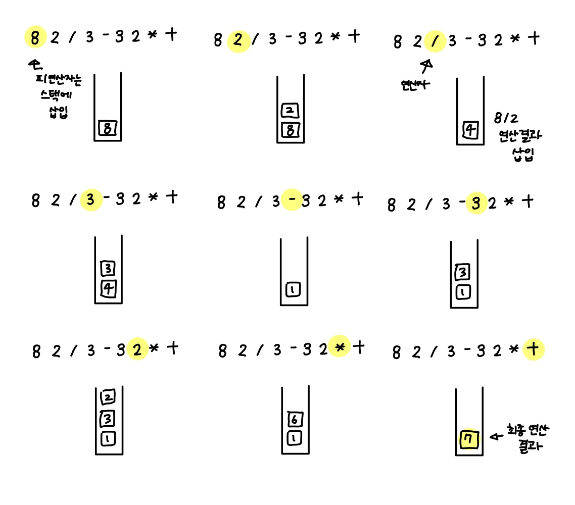 - 연산자면 필요한 수만큼의 피연산자를 스택에 꺼내서 연산을 실행하고 연산 결과를 다시 스택에 저장