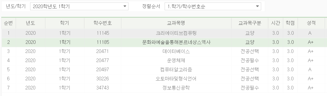 1학기 성적이 떴다. 생각보다 잘 나왔다. 정보통신공학 너무 힘들었는데 A+ 받아서 뿌듯했다. 데이터베이스도 기말고사 1등 했다! 대부분 A+이고 최저 성적이 A였다. 입학 후 가장 좋은 성적을 받았다. 무엇보다 전공과목을 많이 들을수록 성적이 오른다는 점이 기분 좋았다.