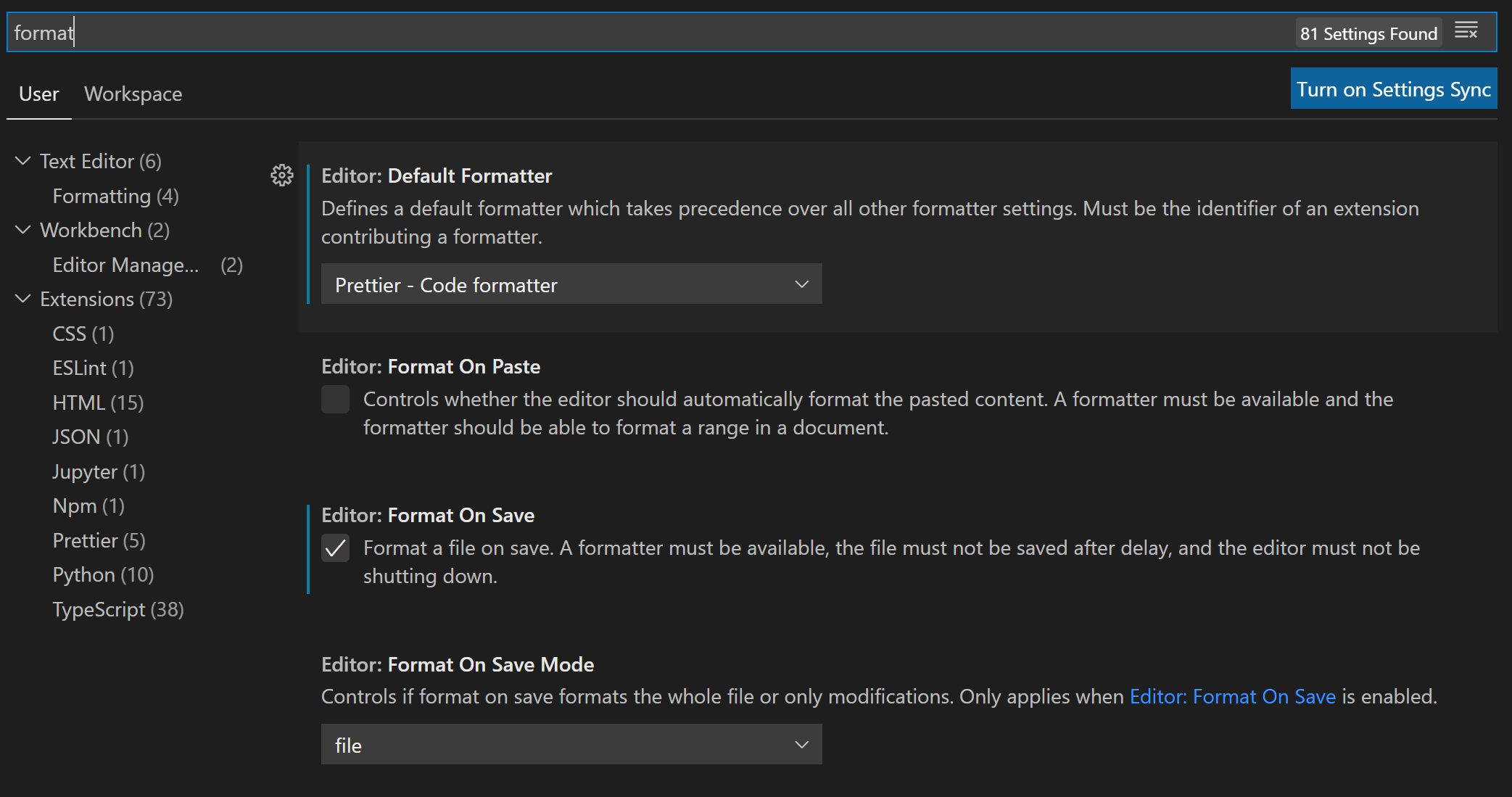 Default Formatter를 Prettier로 설정한 다음 Format on Save 설정을 체크해주세요. 저장 이외에도 타이핑했을 때마다 붙여넣기 할 때마다 자동으로 포맷되도록 설정할 수 있습니다. 저장 시 자동 포맷팅 기능을 활용하면 편하게 개발이 가능합니다. 그럼 모두 즐코딩 :D