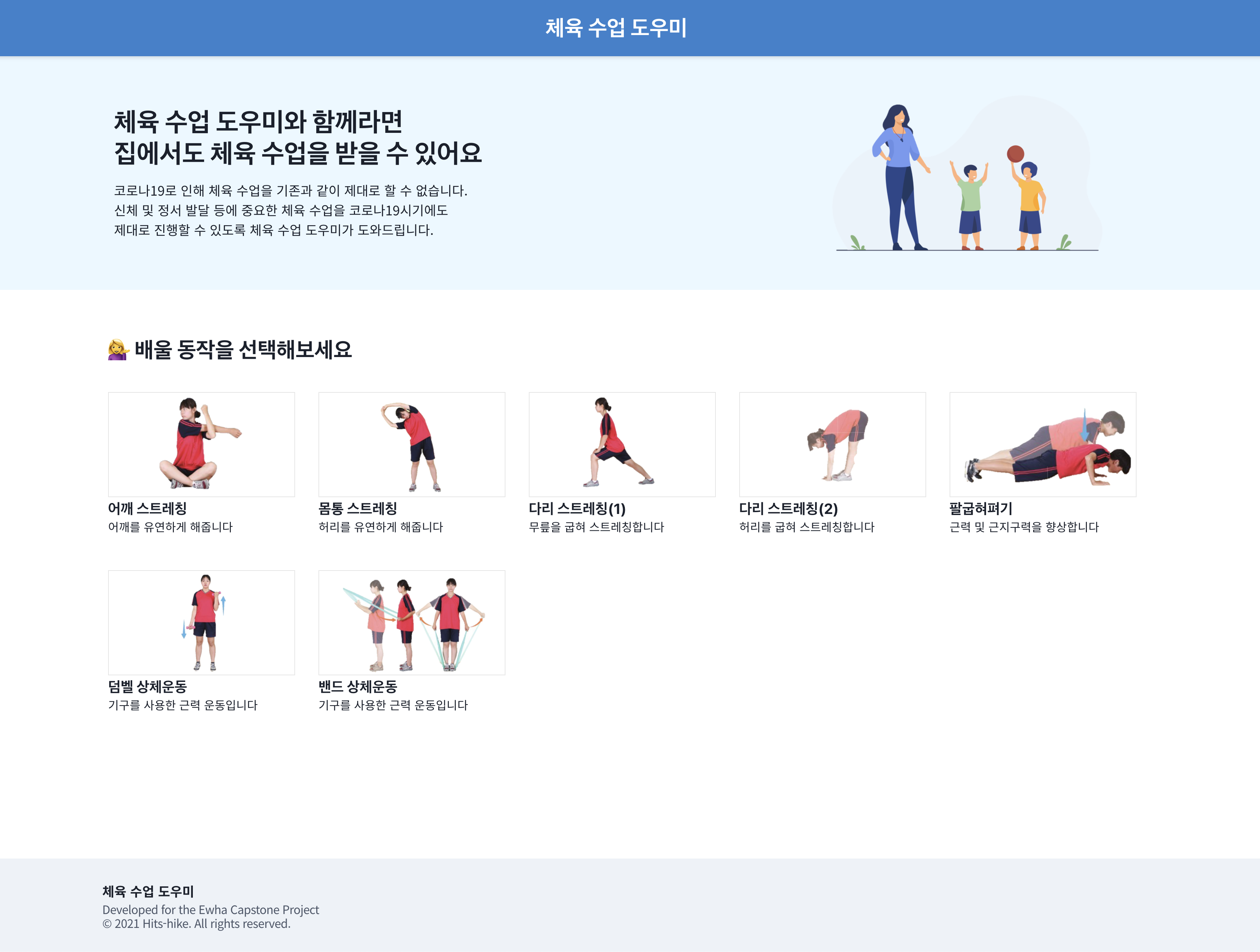 체육 수업 도우미와 함께라면 집에서도 체육 수업을 받을 수 있어요 코로나19로 인해 체육 수업을 기존과 같이 제대로 할 수 없습니다. 신체 및 정서 발달 등에 중요한 체육 수업을 코로나19시기